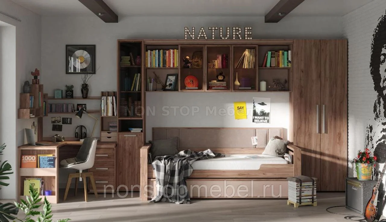 Организовать хранение в комнате подростка поможет вместительный навесной шкаф Nature 81. Навесной шкафчик шириной 2241 мм с двумя открытыми отделениями и тремя за стеклянными тонированными фасадами. Стеклянные полки выдерживают до 2 кг каждая. Шкаф декорирован составным карнизом в стилистике всей молодежной коллекции Nature.