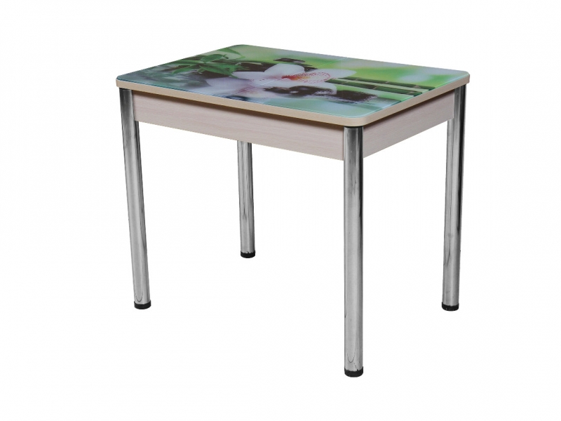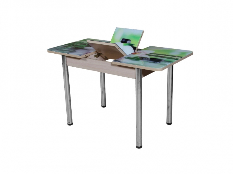Раздвижной обеденный стол "Триумф" имеет круглые металлические ножки и столешницу 26 мм, покрытую стеклом с фотопечатью. Механизм синхронного раздвижения столешницы и центральная вставка - "бабочка". Стекло закаленное, ударо- и жаропрочное. При производстве столов применяется уникальная технология окрашивания вжигаемой в стеклянную поверхность керамической краски, которая становится его частью и не снимается даже под механическим, химическим воздействием.