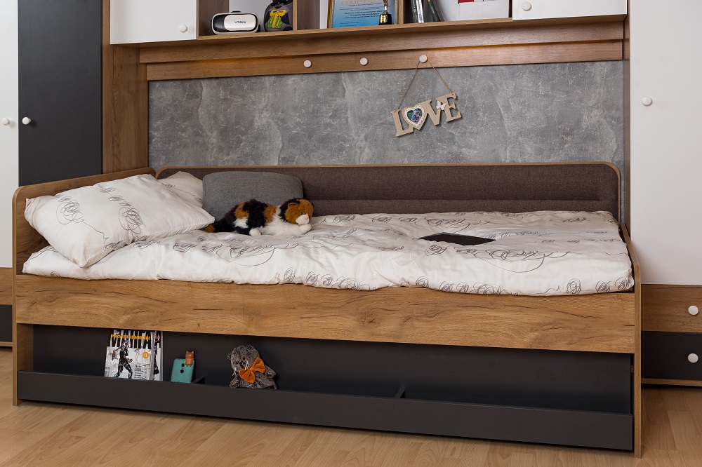 Подростковая кровать из коллекции «Лойс» - комфортное спальное место с большим выкатным ящиком на роликах. Изголовье и изножье имеют скругленные углы и облицованы ударопрочной кромкой, что наиболее актуально в детских. Ящик имеет удобную ручку-карман, куда можно сложить все необходимые перед сном предметы: телефон, книгу, другие личные вещи ребенка. Кроме того, выдвижной ящик используется не только как место для хранения, но и как дополнительное спальное место.
