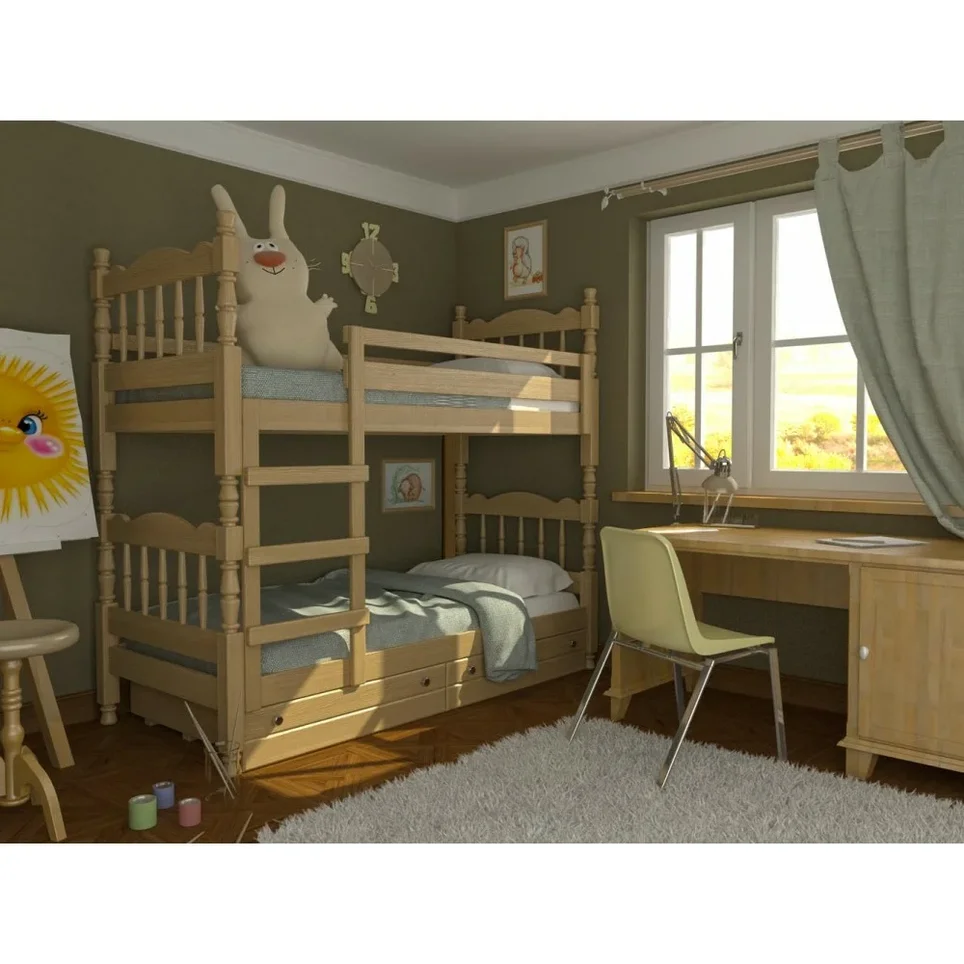 Двухъярусная кровать "Соня" изготовлена из массива сосны. Для безопасности второй ярус кровати оснащён перилами. Крепление лестницы возможно на любую из сторон.