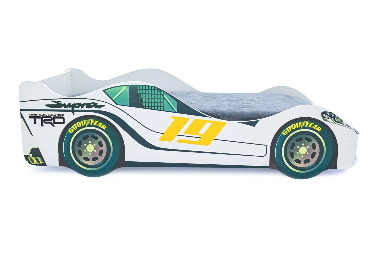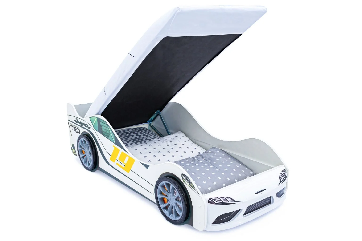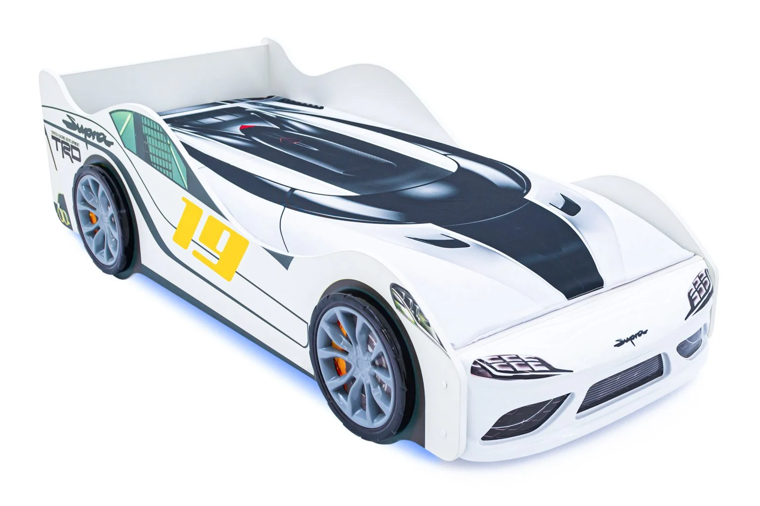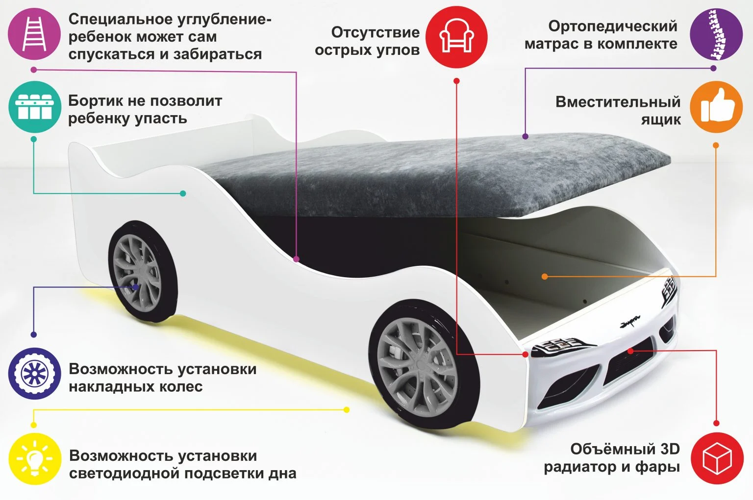 Детская кровать-машина “Супра” белая станет любимым местом для сна и игр мальчика или девочки от 2 до 10-12 лет.