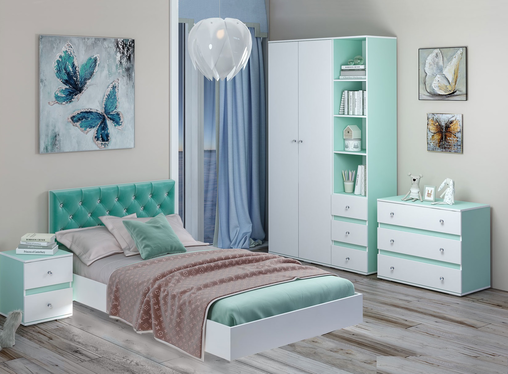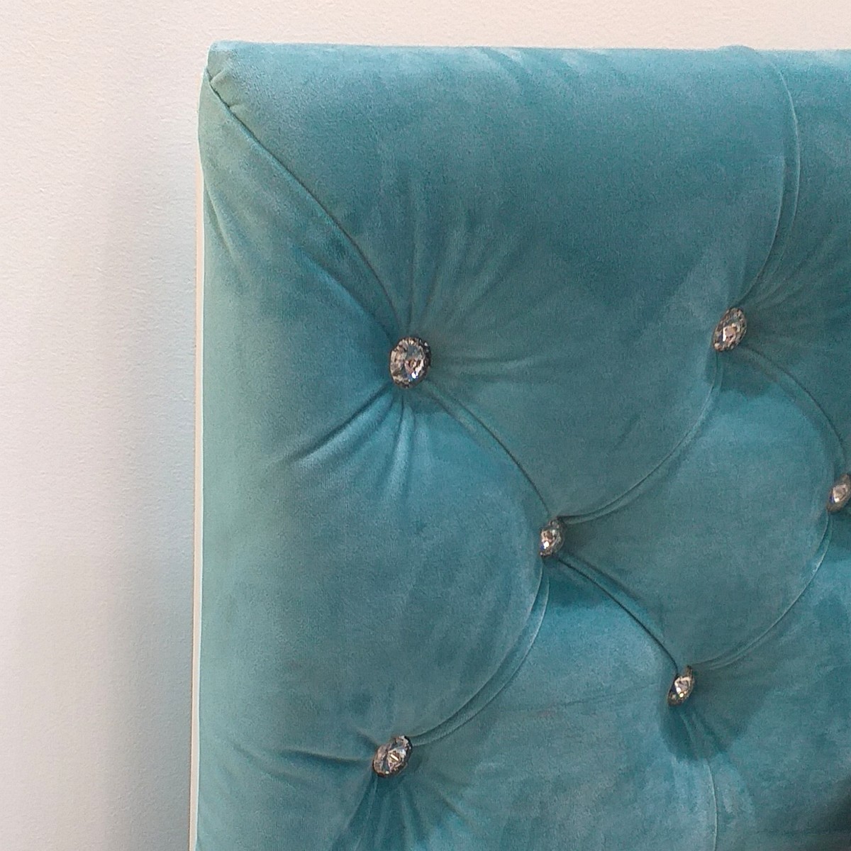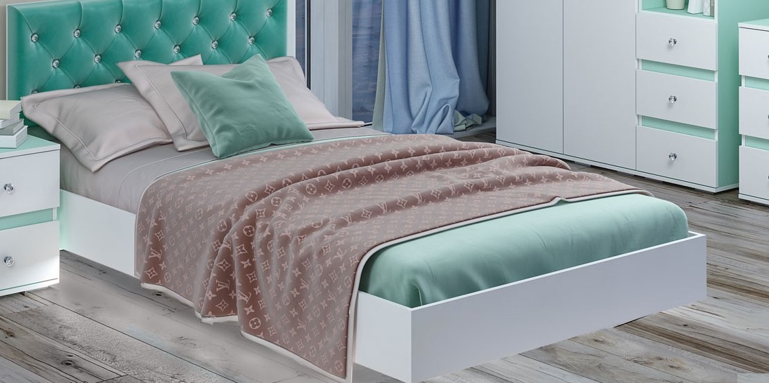 Полноразмерная "парящая" кровать "Тиффани" декорирована мягким изголовьем из благородного бархата цвета "Тиффани" с россыпью из страз. Кровать комплектуется пятью проложками из ЛДСП. Дополнительно можно приобрести подсветку кровати.