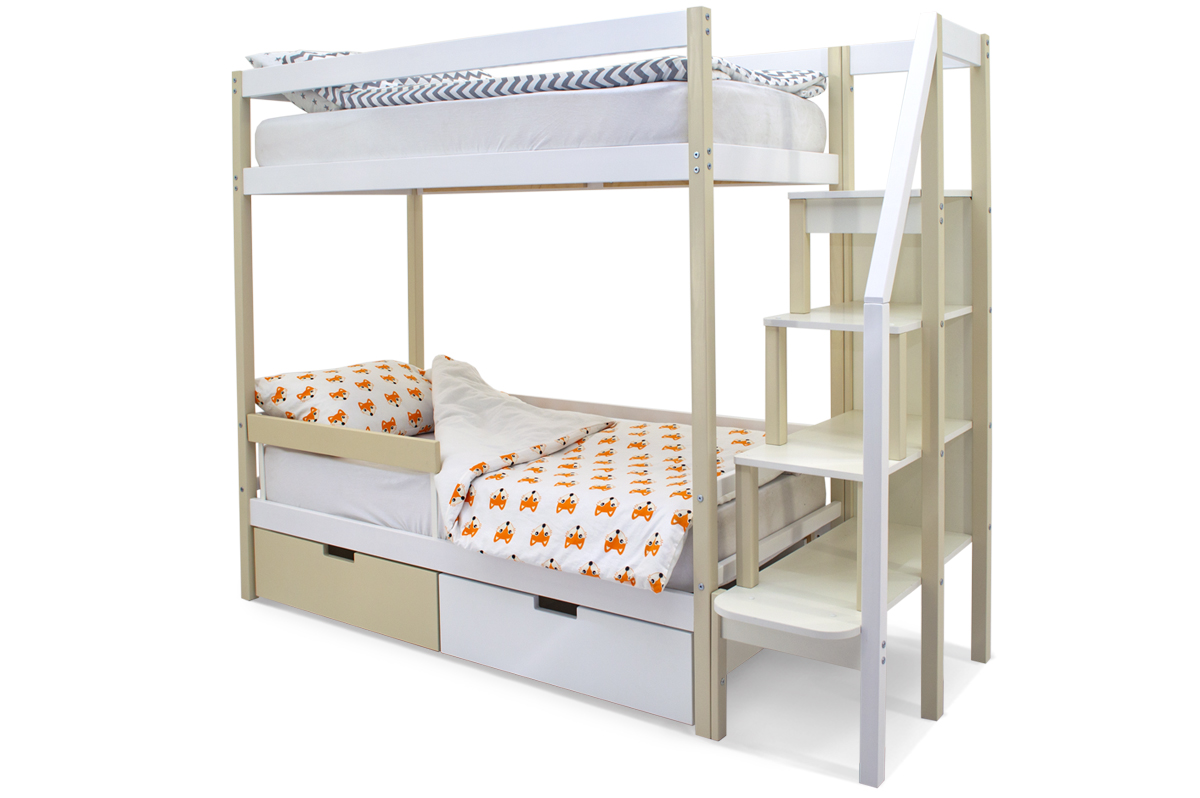 Благодаря своей конструкции, при которой оптимальна высота между ярусами и ширина спальных мест, кровать комфортна и удобна для сна и игр. Лестница и ящики под кроватью – это отличные места для хранения любых вещей.
