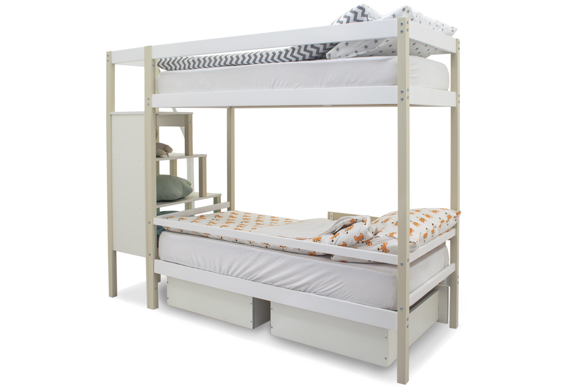 Детская двухъярусная кровать Бельмарко “Svogen бежево-белый” решает проблему нехватки места в детской комнате мальчика или девочки от 2 до 10-12 лет. Благодаря двум ярусам и компактным размерам позволяет здорово сэкономить пространство детской комнаты.