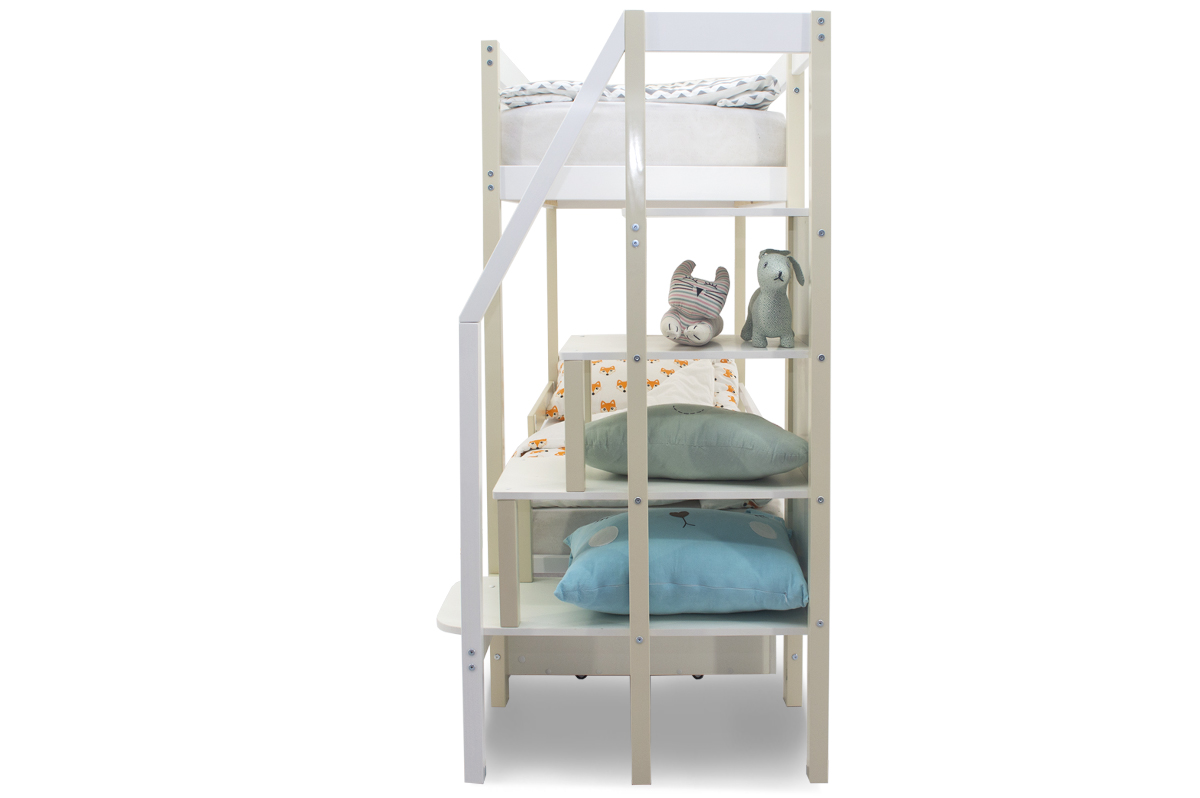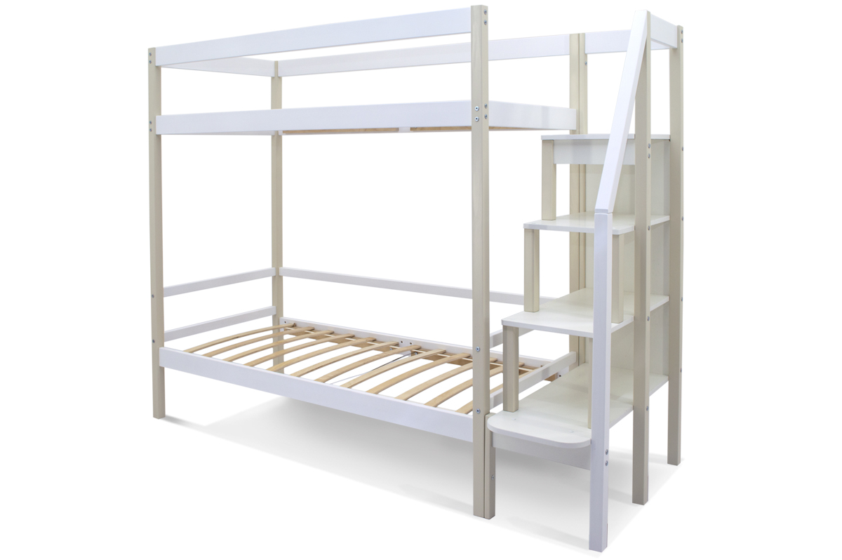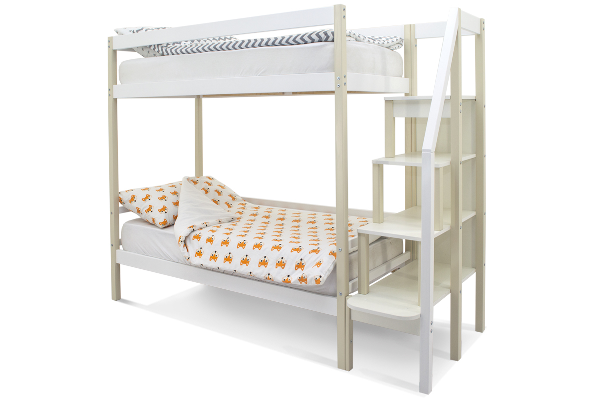 Кровать оборудована практичной лестницей-стеллажом. Полки лестницы можно использовать для игрушек, книг, ночника. Лестницу легко зафиксировать как справа, так и слева от кровати, что очень удобно. На каждом ярусе установлено прочное ортопедическое основание из 12 лат. Спальное место выдерживает нагрузку до 200 кг.