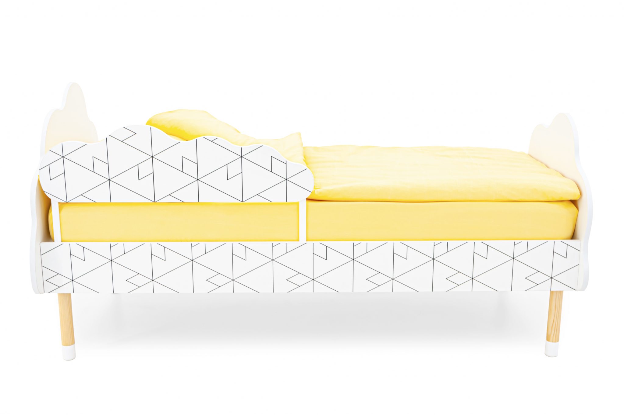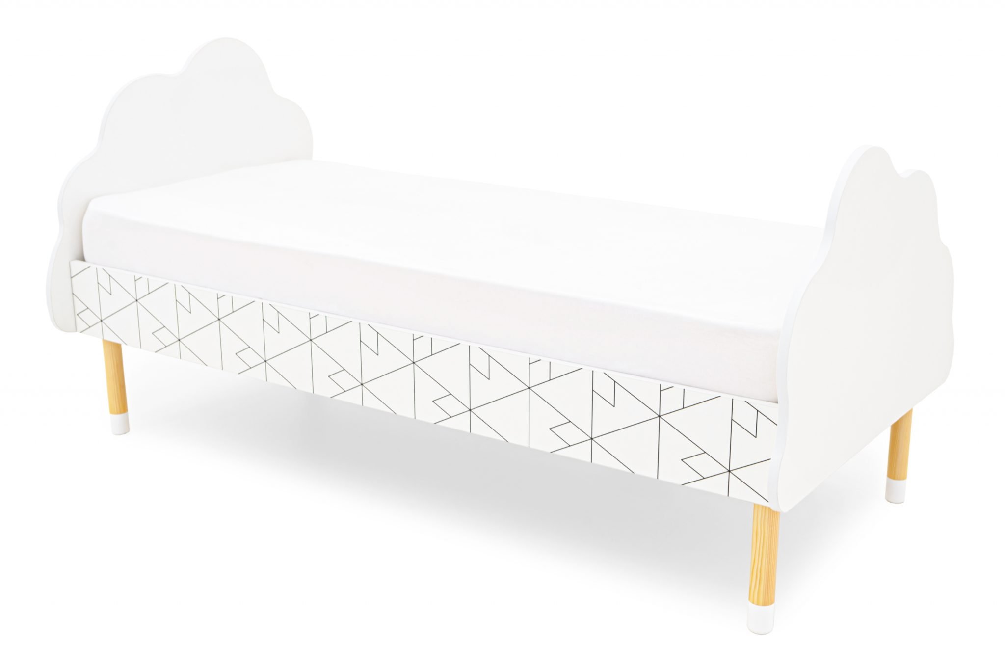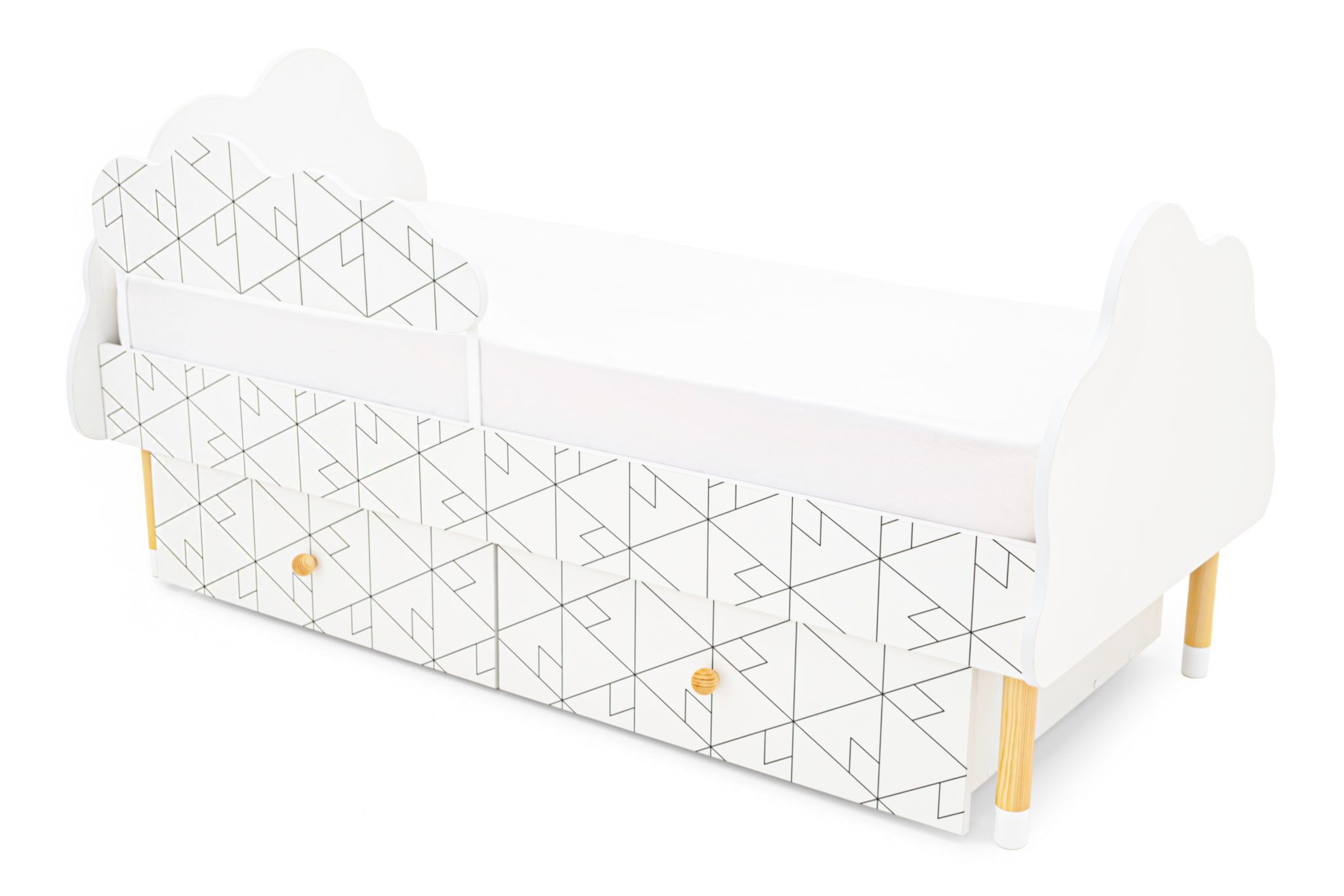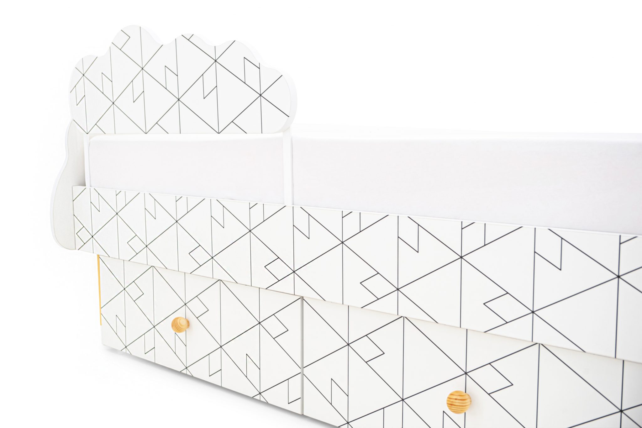 Изголовье и изножье кроватки сделаны в виде облака. Высота от пола до самого высокого места составляет 66 см. Это позволяет даже маленькому ребенку комфортно забираться и спускаться с нее, не рискуя упасть. Специальная конструкция кровати позволяет с лёгкостью присесть или прилечь рядом взрослому, если ребенок не может заснуть.