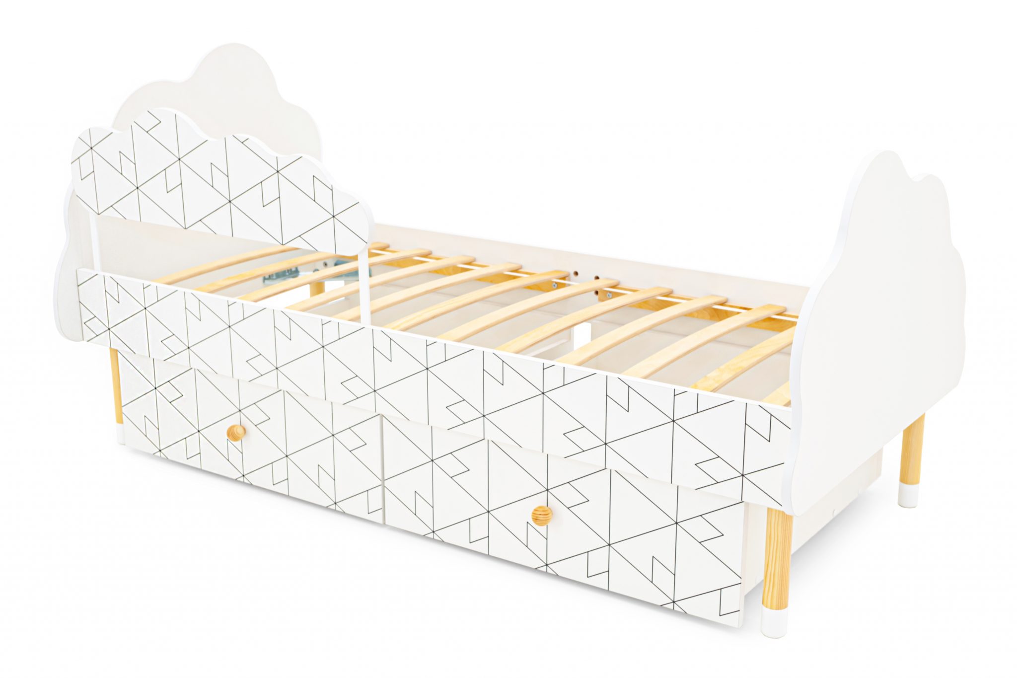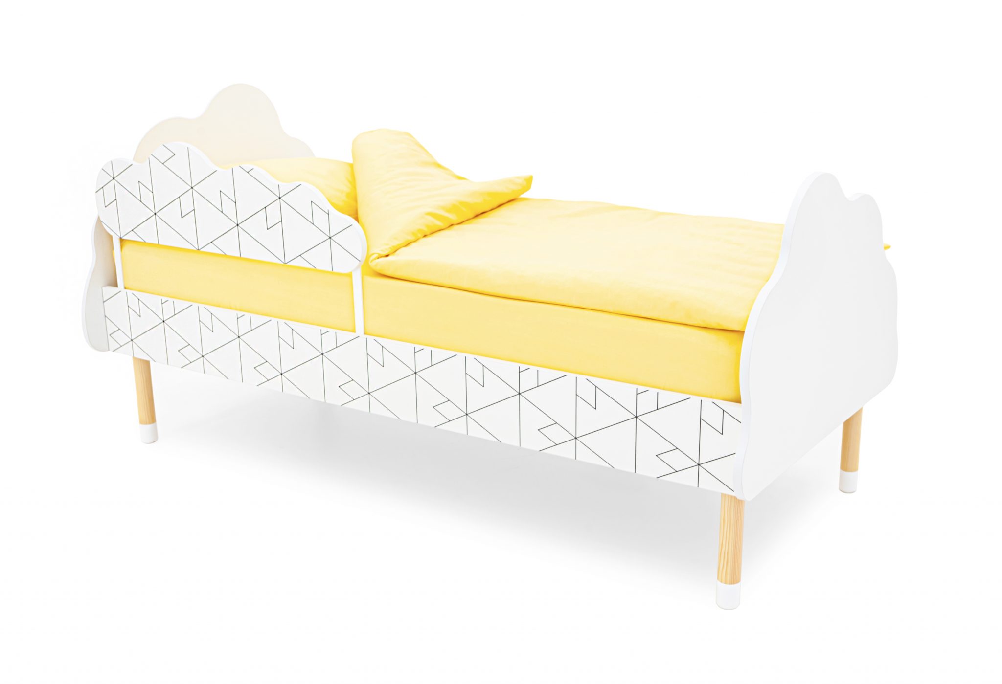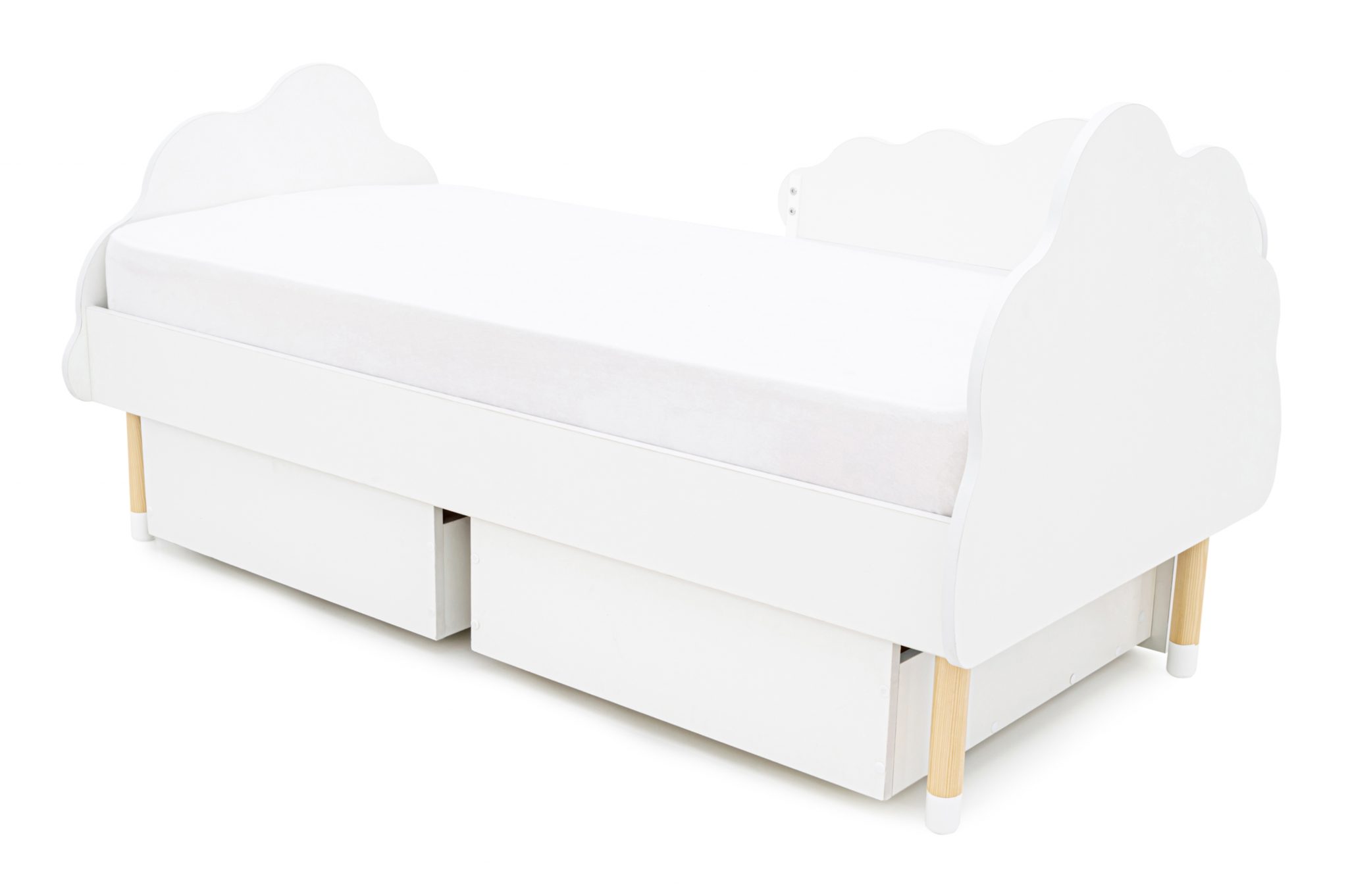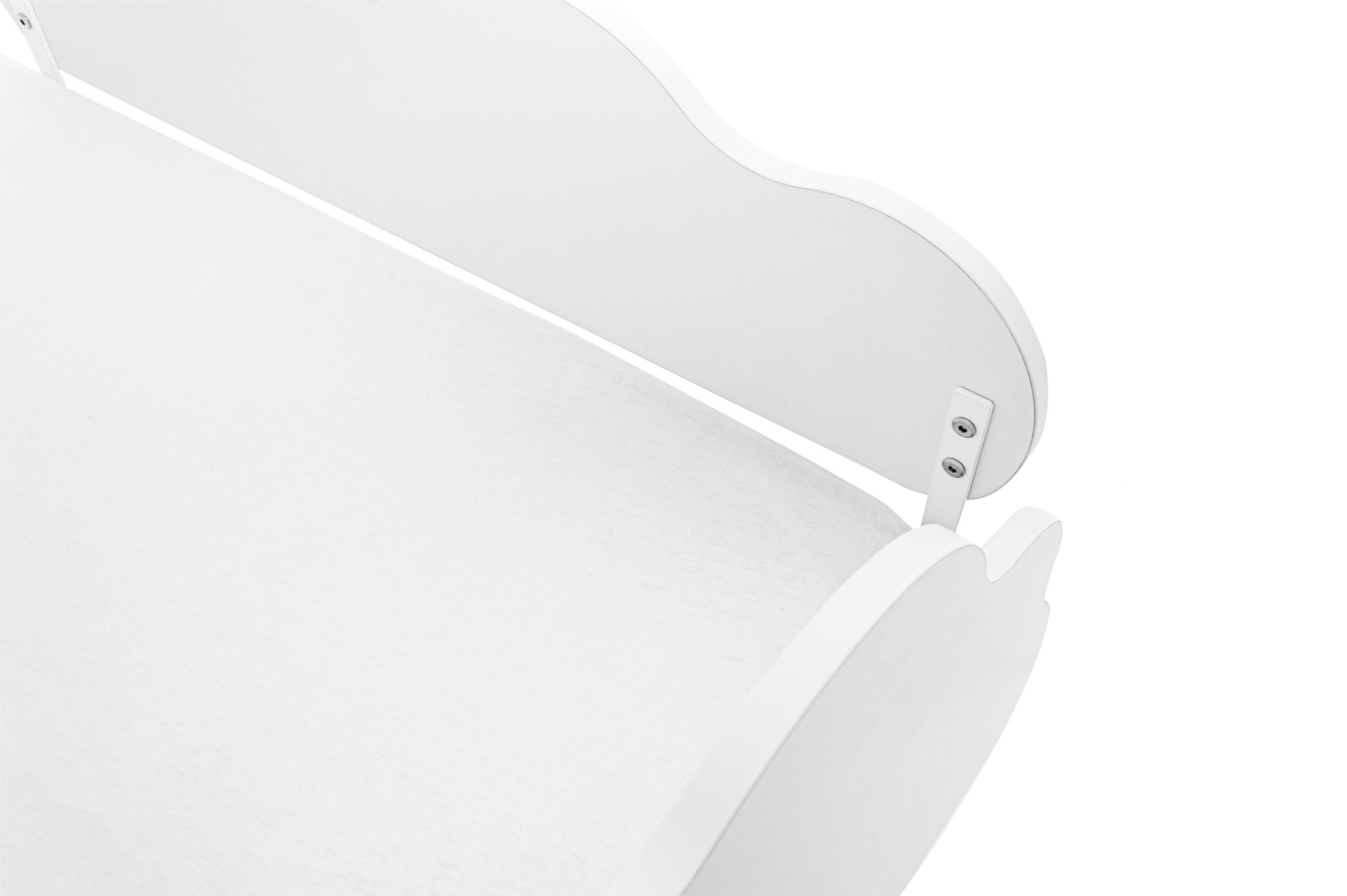 Изголовье и изножье кроватки сделаны в виде облака. Высота от пола до самого высокого места составляет 66 см. Это позволяет даже маленькому ребенку комфортно забираться и спускаться с нее, не рискуя упасть. Специальная конструкция кровати позволяет с лёгкостью присесть или прилечь рядом взрослому, если ребенок не может заснуть.