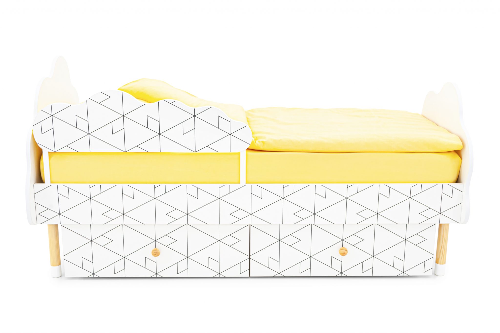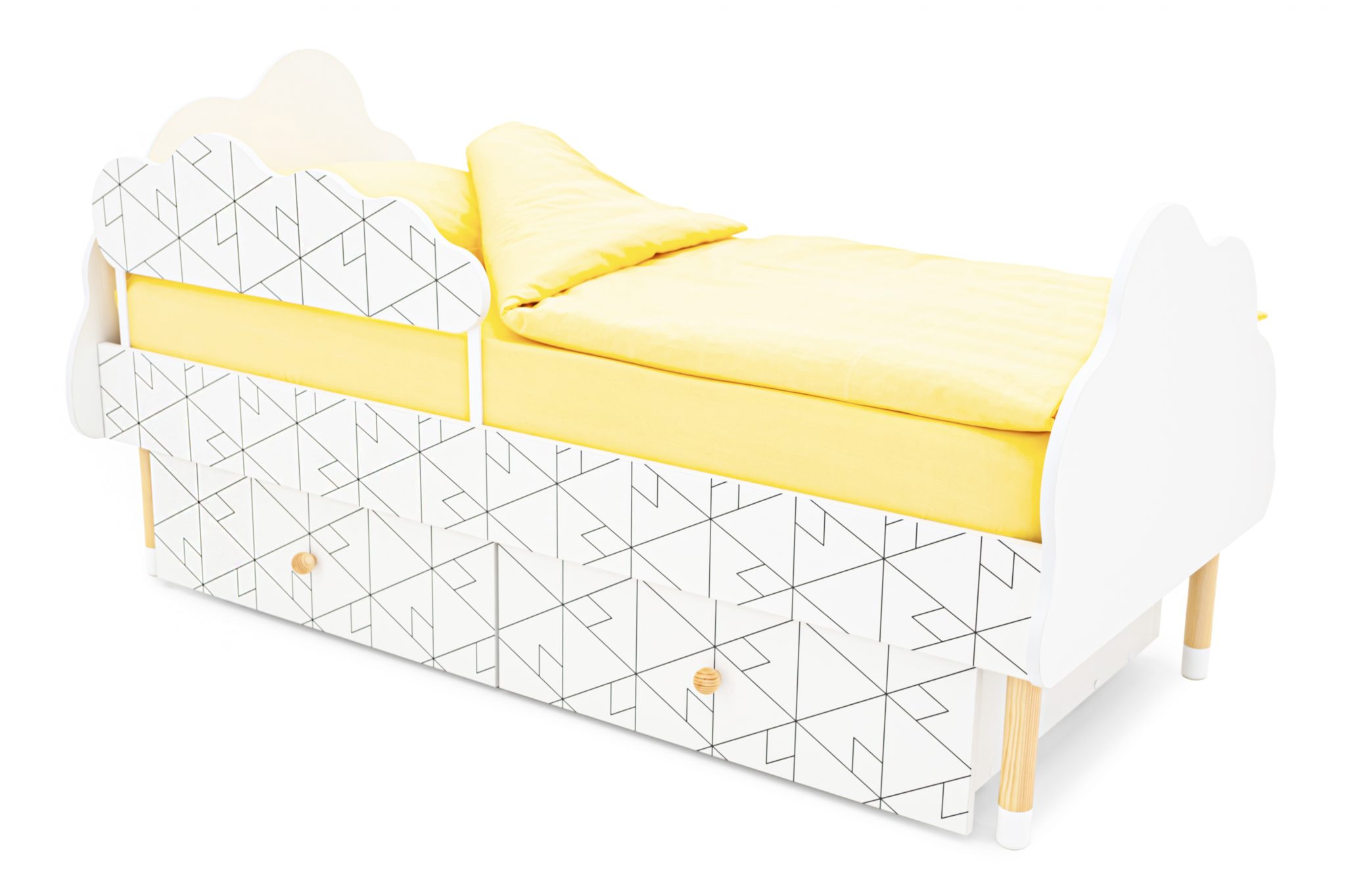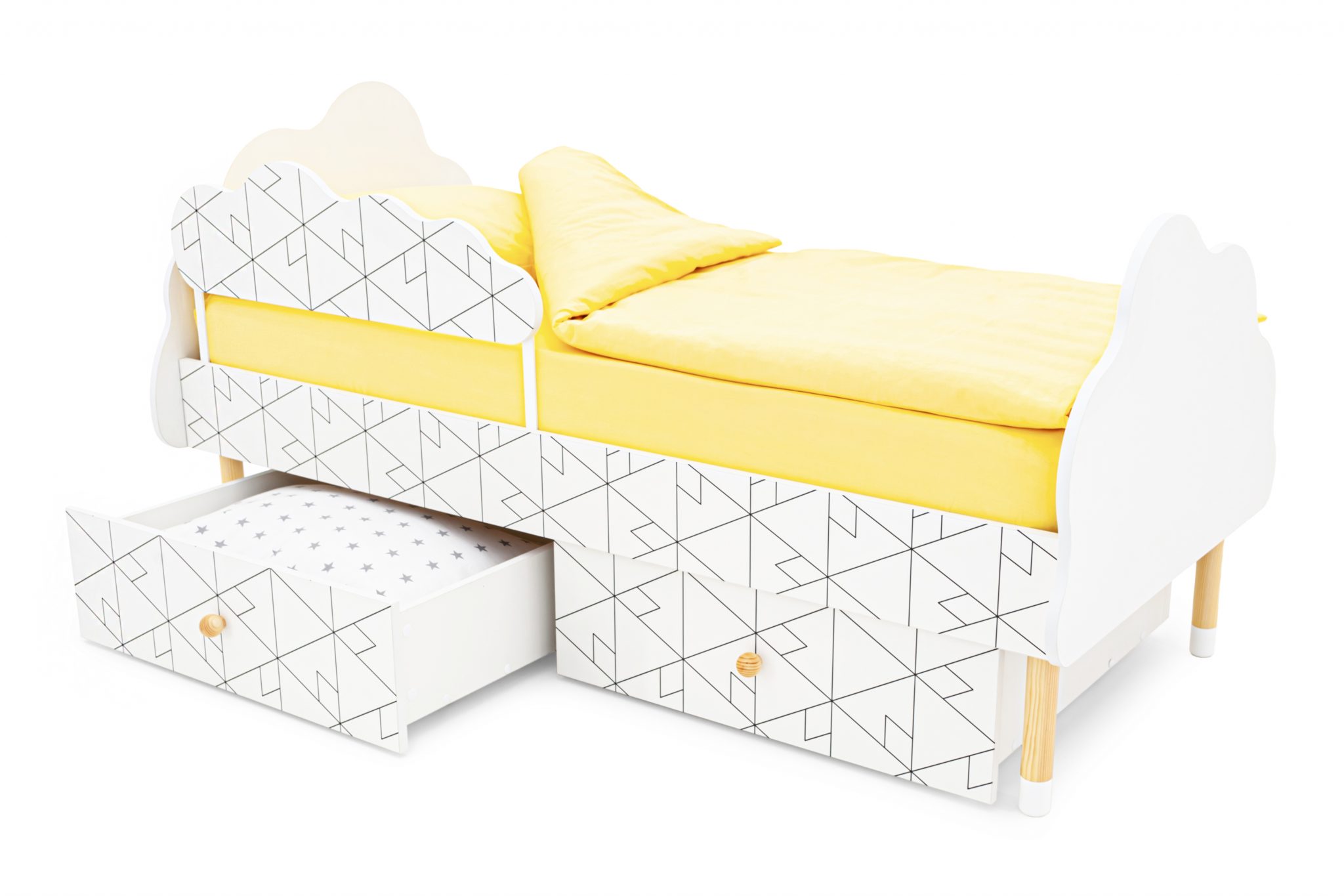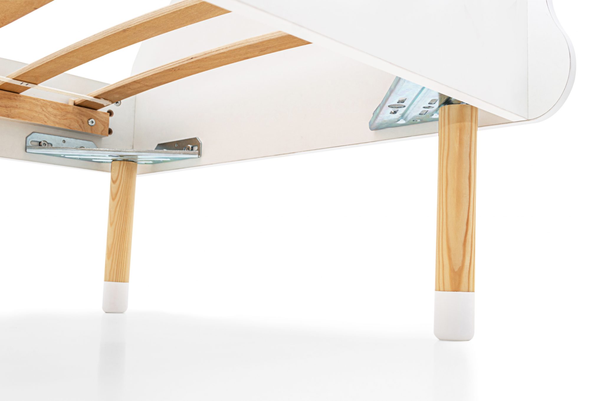 Изголовье и изножье кроватки сделаны в виде облака. Высота от пола до самого высокого места составляет 66 см. Это позволяет даже маленькому ребенку комфортно забираться и спускаться с нее, не рискуя упасть. Специальная конструкция кровати позволяет с лёгкостью присесть или прилечь рядом взрослому, если ребенок не может заснуть.