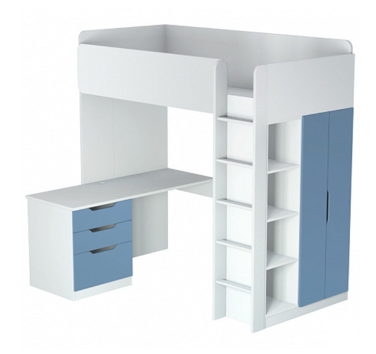 Рабочая зона: включает в себя письменный стол и тумбу с ящиками. Ящики установлены на шариковых направляющих и способны уместить большое количество школьных принадлежностей. Выдерживают нагрузку до 15 кг. Стол можно установить параллельно или перпендикулярно кровати. Для удобства в столешнице есть специальные отверстия, где можно спрятать провода от компьютера или зарядного устройства.