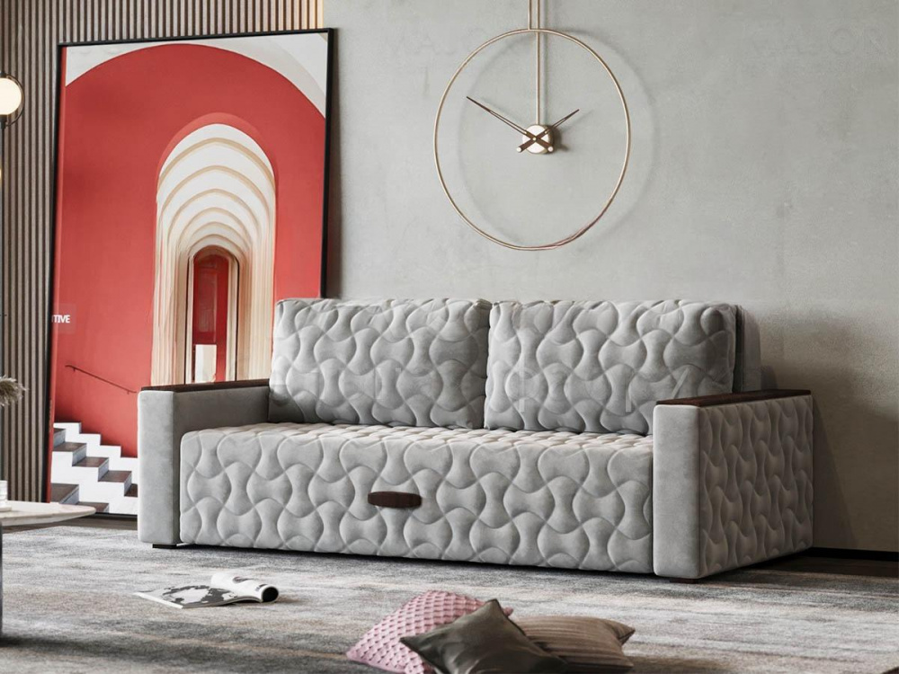 Диван отлично впишется в любой стиль интерьера. Боковины украшены деревянным декором.