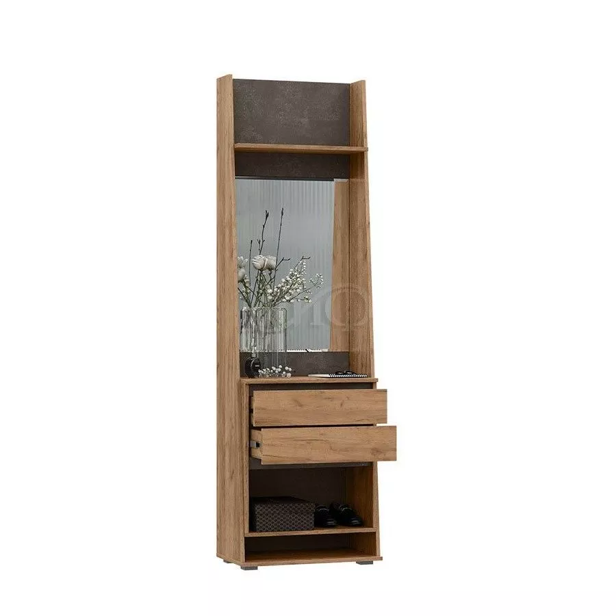 Шкаф с зеркалом для прихожей "Соренто" - многофункциональный модуль. Шкаф имеет открытую нишу для обуви, отделение с распашной дверцей, два выдвижных ящика для аксессуаров и других мелочей, полку для головных уборов. Модуль оснащен прямоугольным зеркалом.