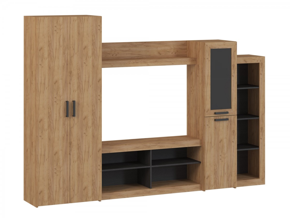 Вместительная стенка для небольших помещений. В гостиной «Oskar -4» предусмотрено: пенал, со стеклянной и глухой дверью, пристройка с открытыми полками, для хранения мелочей, бумаг, книг. Место для телевизора и аппаратуры. Полка для сувениров и фотографий. Плательный шкаф для хранения вещей на выдвижной штанге и на полках. За счет уменьшения высоты у пенала и пристройки, стенка имеет более облегченный вид.