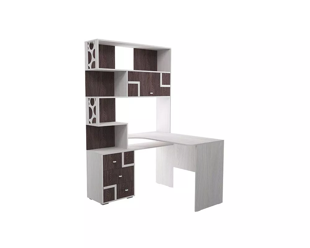 Угловой письменный стол с открытыми полками, одним отделением с откидной створкой и тремя выдвижными ящиками.