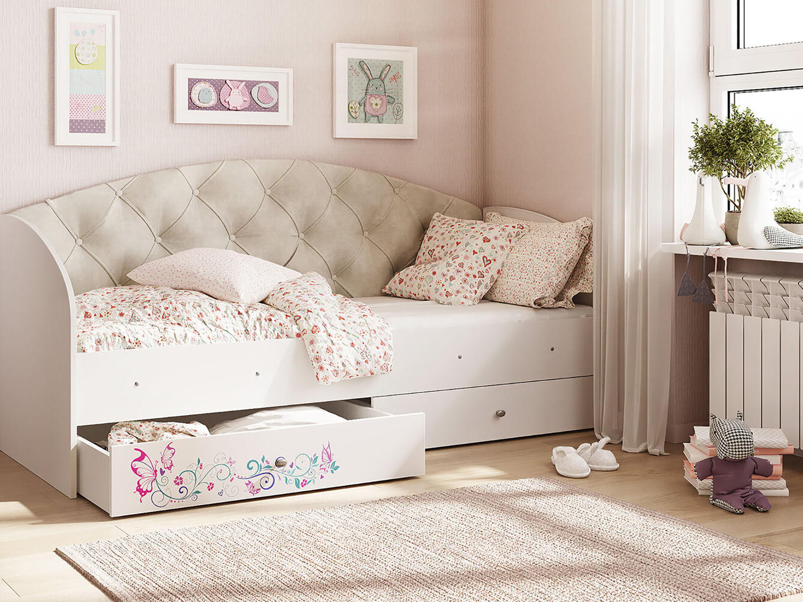 Кровать «Эльза» станет идеальным вариантом. Наличие двух выдвижных ящиков создают дополнительное место для хранения постельного белья, игрушек или вещей. Спинка кровати обтянутая мягкой тканью, превосходно гармонирует с фотопечатью на фасаде ящиков.