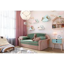 Компакиный детский диван. Ровное спальное место сформировано на основе деревянной рамки с латами, на которую уложен эластичный ППУ. Присутствует выдвижной короб для хранения постельных принадлежностей. Комплектуется декоративной подушкой.