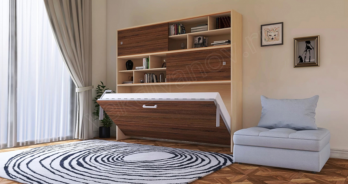 Недостаточное количество площади в маленьких квартирах заставляет владельцев искать практичную мебель с повышенной функциональностью. При помощи подъемного механизма конструкция меняет положение с горизонтального на вертикальное, скрываясь на день в шкафу.