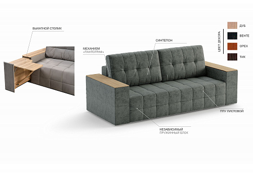 Огромным преимуществом данной модели, является наличие выкатного столика в одном из подлокотников, оснащённый доводчиком на закрывание. Во-втором подлокотнике находится ламинированный ящик, куда по необходимости можно сложить вещи.