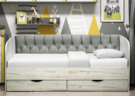Детская кровать "Софа-13" с мягкой спинкой превосходный выбор для вашего ребёнка. Кровать с мягкой головной спинкой, двумя ящиками и съемным бортом. Борт можно отодвинуть в любую удобную сторону. Кровать изготовлена из высококачественного ламинированного ЛДСП экологического класса Е1, подходящего для детей. Спинки по кругу окантованы резиновым кантом из ПВХ. Выкатным механизмом ящиков является четыре роликовых колёсика. Ручки ящиков интегрированные (выемки).