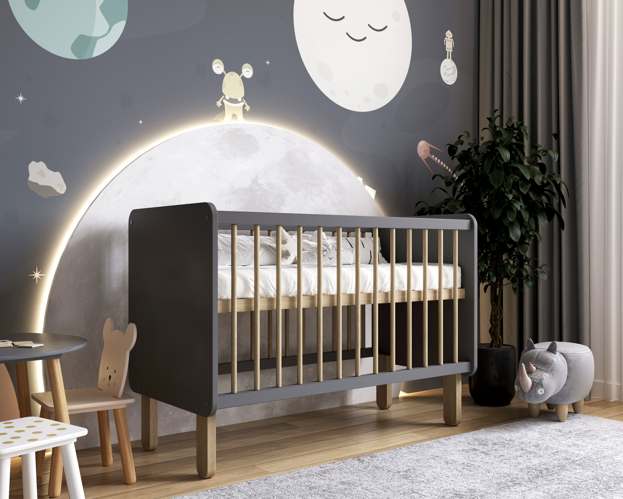 ▪️ Передняя стенка кровати полностью убирается, таким образом кроватку можно использовать как приставную.