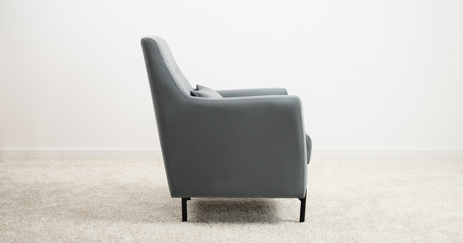 Декоративная утяжка на спинке кресла, декоративная подушка в цвете кресла, металлические опоры переходят в декоративный элемент подлокотника