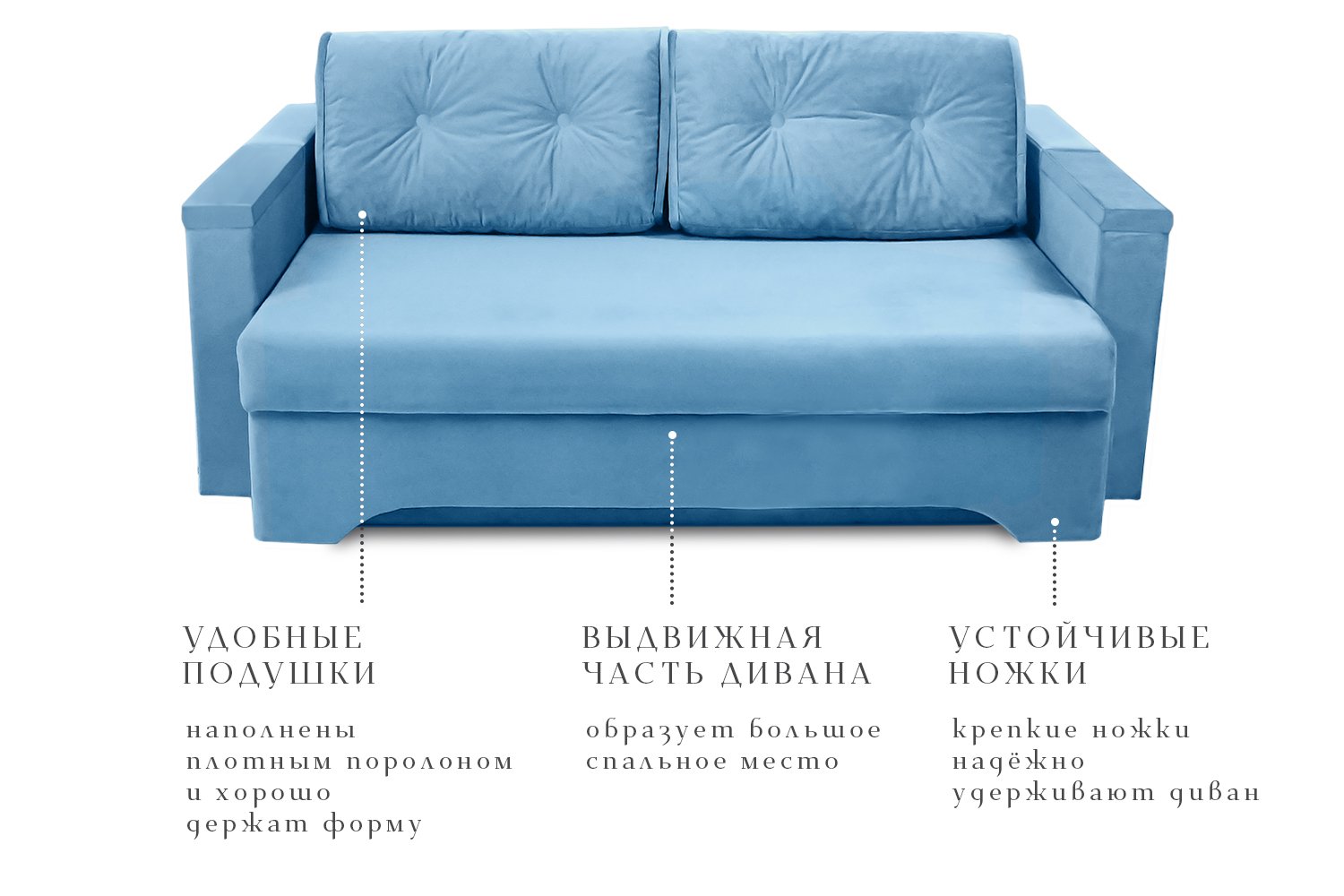 Мягкие элементы сидения и спинки сформированы из пенополиуретана. Независимые подушки, наполненные мягкими элементами пенополиуретана, придают дополнительную мягкость спинке изделия. В основании сидения имеется ниша для хранения постельных принадлежностей. Спальное место формируется на основе механизма трансформации "Еврокнижка". Каркас изделия выполнен из хвойных пород древесины, древесно-плитных материалов.