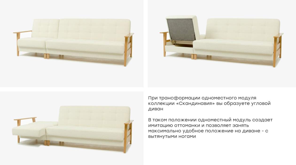 При трансформации одноместного модуля коллекции «Скандинавия» вы образуете угловой диван. В таком положении одноместный модуль создает имитацию оттоманки и позволяет занять максимально удобное положение на диване - с вытянутыми ногами.