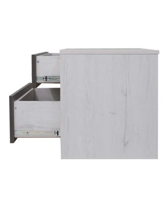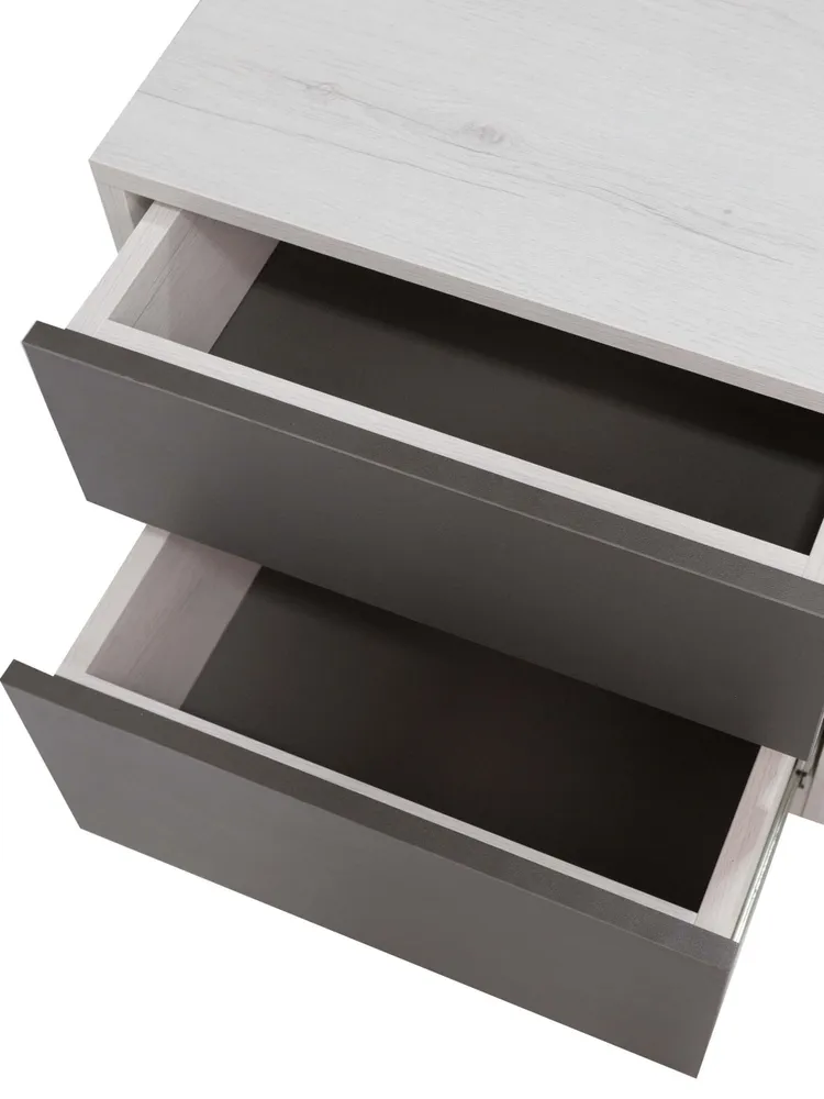 Прикроватная тумба идеально впишется в интерьер спальни в серии "Нильс" в трендовом сочетании графитового и фактурного белого.