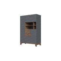 Основным материалом для изготовления боковин и фасадов служат современные конструктивные и отделочные материалы – МДФ и ламинированная ДСП (ЛДСП) разной толщины. Применение таких материалов позволяет снизить стоимость комплекта без утраты его функциональности и декоративности. Для отделки фасадов использовано два цветовых оттенка – платина премиум и бодега белая. Подобные оттенки создают иллюзию света и объема даже в достаточно скромной по размерам комнате.