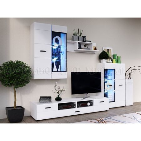 Изысканная, белоснежная с приятным блеском гостиная, несомненно украсит собой любую квартиру или дом. В гостиной есть все необходимые элементы для красивого оформления комнаты. Фасады с фрезеровкой и стеклянные витрины создают современный и стильный образ вашему дому.