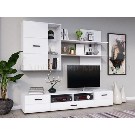 Изысканная, белоснежная с приятным блеском гостиная, несомненно украсит собой любую квартиру или дом. В гостиной есть все необходимые элементы для красивого оформления комнаты. Фасады с фрезеровкой и стеклянные витрины создают современный и стильный образ вашему дому.